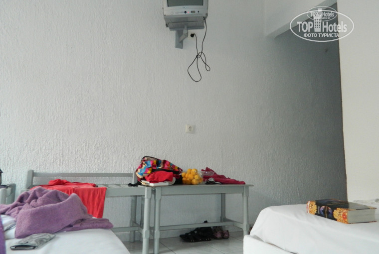 Номера. У нас был номер на 2ом этаже с балконом. Очень простой номер. Тумба между кроватями, кровати, стол, 2 табурета и 1 нечто вроде табурета, только вместо сидения решетки - наверное чтобы вещи сушить. Кровати представляли собой некое каменное ложе с матрасом, т.е. были необычные кровати а полностью приделанные к полу, поэтому при бронировании номера у туроператора и на ресепшн уточняйте какие кровати Вам нужны. Сдвинуть Вы их не сможете. В номере есть телевизор - но мы его не включали, ретро телефон - дисковой. Но мы и им не пользовались. Холодильника нет. Его могут принести за доп плату (не брали - не знаю сколько стоит). Кондиционер центральный - тоже за доп плату. Мы его не брали, т.к. стоил он дороговато, но я уже не помню сколько точно. Днем мы спали с приоткрытыми дверями в номер и открытым балконом - делали сквозняк. А к тому времени, что мы приходили ночью уже становилось посвежее. Либо пользовались влажными полотенцами, когда было совсем невмоготу. Убирали номер где-то через 2-3 дня. Полотенца тоже меняли при каждой уборки. Фена нет. Сан узел нормальный. Холодная и гор вода есть правда напор не суперсильный и воду горячую чуть подождать надо. Балкон был просторный, стоит пластиковый стол и 2 стула. Мы обычно на балконе сидели после ужина, до баров. На балконе прохладно и приятно посидеть выпить, слушать музыку и болтать перед походом в бары. Вид у нас был на переулочек (налево открывался вид гор, поселка, направо видно было главную улицу слегка). Переодически по этому переулочку проезжают скуторы с местными, т.к. этот переулочек ведет в основную часть поселка, но они нам не оч мешали - мы спали крепко. Никакой живности в номере не было. Мебель конечно старовата. Есть шкаф еще. Входные двери на обыкновенный ключ. Замок очень простой.