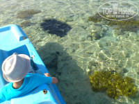 Пляж для семьи с маленькими детьми самое то. Глубина воды в море увеличивается постепенно и не страшно за детей. Лежаков правда не хватало, но, думаю, это из-за того, что предприимчивые туристы заранее вешали на лежаки свои полотенца, а сами пропадали на несколько часов, когда в это время этим местом могли воспользоваться другие: все равно никто по полдня уж на пляже торчать не будет. Но такую картину наблюдали постоянно. В море недалеко от берега (метров 80) есть островок. Возле него можно полюбоваться кораллами и красивыми рыбками. Можно туда доплыть, а можно обойти с правой стороны лагуну за рыбным рестораном и дойти по мелководью, но в обуви (по камешкам больно). На территории отеля есть магазинчики, но дешевле конечно покупать на экскурсиях.