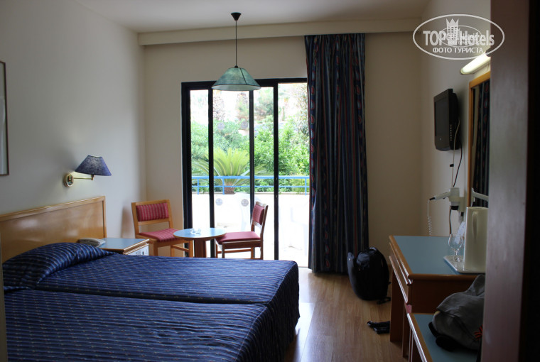 Отель 3* и это надо учитывать когда вы туда едете. Заселили нас сразу, т.к. мы приехали уже в третье часу дня. Как уже говорилось ранее заселили нас на нулевой этаж (там же где ресепшн), вид во двор, но спасало то, что наш номер был почти последним по коридору и балкон прикрывали кусты, так, что нас особо никто не видел и мы никого. Балкончик достаточно широкий, больше похож просто на терассу, т.к. соседей вы видеть будете. Номер маленький и из минусов лично для нас были 2 раздельные кровати, хотя и стоящие вместе, т.к. мы с мужем любим спать всё таки вместе, а на таких кроватях не поспишь, но мы небольшие и поэтому умещались на одной или спали раздельно иногда. Еще о номере: маленький, 2 кровати, шкаф и 10 вешалок (нам хватило), нет холодильника (за доп.плату 4 евро в день), нет переходника, но внизу в магазинчике прямо в отеле его можно купить за 2 евро, телек с двумя русскими каналами, интернета нет бесплатного нигде в отеле, только за отдельную плату. Ванная нормальная, чистая и новая сантехника grohe, только учтите, что кроме мыла ничего больше нет из ванных принадлежностей. Полотенца есть в номере, пляжные в аренду можно взять за 2 евро и 5 евро берут в залог, потом возвращают, мы брали одно на прокат, а одно купили за 7 евро в супермаркете Папантониу. Лучше берите свои. П.С. туал.бум. есть. Убирают хорошо, мы оставляли по 1 евро чаевых.