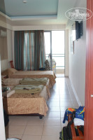 Номер с видом на море нам дали очень хороший. На 3 этаже, номер 306. Вид из окна замечательный. В номере все новое, все работало. 3 кровати больших (2 сдвинуты, одна отдельно). Плоский телевизор, хороший фен, телефон, холодильник, сейф ( 20 евро за 7 дней), зеркало с комодом, тумбочки, столик журнальный, 2 стула, пуфик, кондиционер (но мы его не включали), шкаф для одежды, чайник. Балкон нормальный, там стоял столик и 2 стула.