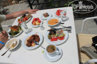 Питание было свежим и вкусным. Блюда на завтрак ежедневно были одинаковыми: сосиски тушеные, бекон жареный, колбаса, сыр, масло сливочное, салат, яичница, тушеная фасоль, какая-то запеканка, помидоры тушеные и т. п. На обед главные блюда были разными, но время от времени повторялись. Овощной салат был всегда, отдельно всегда был сыр фета, естественно оливковое масло, можно было самим делать греческий салат. Супы нормальные (суп из брокколи, луковый суп, суп из фасоли, лапша). Бульон для лапши сделан на основе бульонных кубиков. Мясо и рыба (или кальмары) были всегда. Подавали свинину, курицу, говядину, баранину, приготовленные разными способами. 3 раза за 7 дней подавали мясо, приготовленное на барбекю прямо на улице около столик. Часто было тушеное, жареное мясо. Выпечки было мало, но, каждый день разная и вкусная. Мороженое на всех приемах пищи и после обеда часов с 16 или 17 в любых количествах, тоже несколько видов. Из фруктов: вкусные арбузы, дыни, яблоки, лимоны, апельсины. Несколько раз видели киви и бананы. Соки конечно, что-то типа инвайта, я их не пила. Я заказывала себе свежевыжатый апельсиновый сок за 2,5 евро. Лимонад, кола, спрайт нормальные. Воды в бутылках нет, но в любое время можно взять в баре. Кстати, у этого отеля своя собственная скважина, поэтому воду можно пить из-под крана (проверено на себе). В номере был чайник, мы кипятили воду и делали чай в номере. Из местных бесплатных алкогольных напитков пробовала только пиво (нормальное) и вино красное и белое (оно там сухое, пить можно, но мне не понравилось).