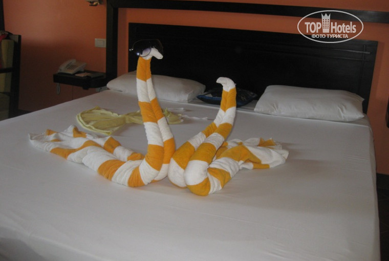 Мы отдыхали тогда первый раз заграницей. Прилетели в 9 вечера, нас отправили ужинать и после сразу же отдали ключи от номера. Номер был отличный, с большой кроватью, с видом на бассейн. Все в номере работало исправно. Номер убирали каждый день, приносили 2 бутылки воды, чай, кофе, сахар; крутили разные фигурки из полотенец. Оставляли через день по доллару.