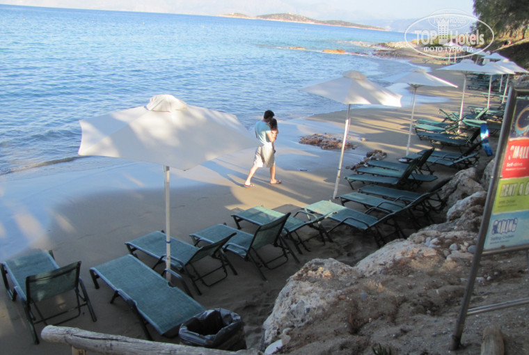 Пляж чистый, маленький, но места хватает всем,лежаки были всегда. Заход в море половина пляжа песок, половина- камни. Море для нас было холодное и волны. Купались мало (но мы особо не фанаты). Дочка моря боялась, только на четвертый день бегала по кромке.