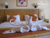 Отдыхали в отеле с 28 мая-5 июня. Номер дали сразу хорошиий , на 2 этаже. Балкон выходил на эстраду,поэтому не было нужды ходить на анимацию, смотрели прямо с балкона. В Шарме я была больше 10 раз- в разных отелях. В этот раз была с мамой,ей 65 лет, поэтому в выборе отеля ориентировалась на нее.Номер-стандарт, достаточно просторный, сейф, огромная кровать,а главное -горячая вода днем и ночью с хорошим напором, что для Шарма скорее исключение. Очень помогли отзывы на этом сайте, было перечитано не мало. Хотелось отдохнуть от московской суеты и шума , отель- не разочаровал! Персонал очень деликатный,вежливый и уважительный по отношению к отдыхающим! Территория отеля очень зеленая, с цветущими деревьями и ухоженными газонами(труда для этого приложено не мало).Пляж-не большой, но лежаков хватало всем.Бар на пляже с прохладительными напитками,кофе, пиво, выпечка, даже пару раз пекли блинчики.Заход в море с берега, что для нас было важно т.к. мама плавает не очень хорошо.До моря не далеко, идти мин.10, но постоянно курсирует автобус ,так что пешком только раза 2 и прошли, обязательно подбирал нас по дороге.У берега обитает семья крылаток, они -ядовиты, близко к ним не надо подходить и они не тронут.Питание нормальное, много выпечки, фрукты- дыня, апельсины,финики .бананы.Для детей в ресторане свои маленькие столики с диетическим меню ,по телевизору показывали " Машу и медведь".Анимамация была каждый день. В 21 час- детская, с 22 ч. для взрослых. Если подвести итог- отель свои 4 звезды оправдывает, плохого ничего сказать не могу. Рекомендую для родителей с детьми и среднего возраста, а т.ж. семейных пар.А кому нужны шумные вечеринки-вам на Ибицу, господа! С удовольствием приедим еще раз!