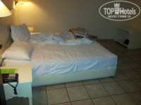 Расселение в отеле: заселили в номер на первом этаже. Номер сверхмаленький (примерно 3,5 х 3,5м), старенькая мебель. Вместо двухспальной кровати две односпальных, застеленных единой простыней. В номере сейф, выданный ключ от которого (2 евро в день) не подошел, в течение часов 5-ти нам пытались подыскать нужный ключ (после неоднократного обращения на ресепшен). В номере очень темно: две прикроватные лампы (бра) и один торшер, при таком освещении трудно даже покрасить глаза, нереально. Телевизор маленький - ходят киндерсюрпризы.
