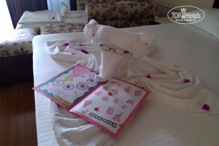 1. Отель. Стандартный номер понравился, старшая спала на отдельной кровати, младшей разложили кресло. Уборка номера качественная, за чаевые еще и произведения искусства получали (слоник на фото). В лобби куча кресел и диванов, можно посидеть в компании (и без), тихо и уютно. Wi-Fi - отдельная история, хорошо развивает терпение. И внутри и снаружи очень чисто, дети каждый вечер играли и ползали по сцене, но одежда всегда была чистой. На территории отеля много цветов и зелени. Остались довольны работой аниматоров миниклуба, старшая их очень полюбила.