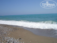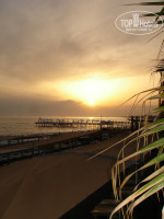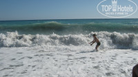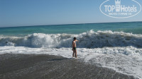 2. Территория. Да она небольшая. Но мне было даже удобно, я на море, ребенок в бассейне на горках. Прибежал, показался маме и опять к друзьям. Было не страшно отпускать его одного играть (заблудиться невозможно). Пляж – галька. Но временами море намывает песок. Вечером уходишь с пляжа кругом камешки, ходить больно, а утром абсолютно песчаный пляж, малыши босяком бегают. Мы плавали с пирса. Когда море сильно штормит, пирс разбирают (мы застали два таких дня). Шторм был не сильный и отдыхающие, несмотря на поднятый красный флаг, все равно плавали.