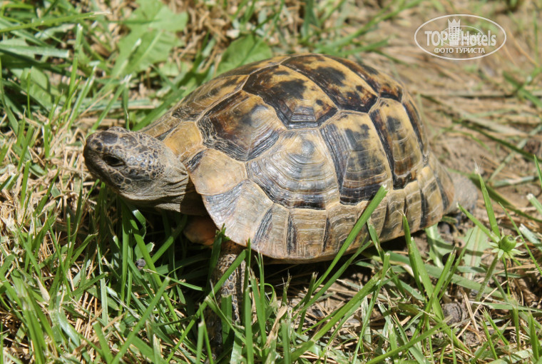 по территории ходит павлин, черепаха, цесарочки носятся