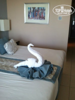 К Аквамарину мы приехали в количестве 5+1 =), две пары и мама с сынишкой. Нас не смогли заселить через 1 минуту, или через 10, так как номера еще убирали. Зато нам предложили попить, отдохнуть в лобби и заполнить анкетки туристов. Персонал общался на инглише, довольно простом и понятном, но мы уже тогда услышали, как забавно женщина говорила с официантом на русском, а он ей на английском отвечал =). Спустя некоторое время, мы столкнулись с проблемой №1 "картинки номеров на сайте Туртесса не совпали с действительностью". Я об этом была не только наслышана и начитана, но мы очень хотели "френч бед" а получили 2 Twin. С этого момента начался квест "найди всеми силами то, что здесь не существует". Пребывая в поисках загадочного номера с френч бедом, в алых тонах, мы посмотрели фемили номер, стандарт, сюпериор, познакомились со всеми сотрудниками рецепшена, и в конце познакомились с Таней. Так как коллеги-арабы Тани плохо понимали на английском о "каком официальном сайте Иберотеля мы говорим (а там тоже есть фотка Аквамарина с красным номером Сюпериор :З) и о каком сайте оператора Туртесс мы говорим", наши поиски казалось вели в никуда. Но Таня поняла, чего мы хотим, и объяснила, что "Иберотель Египта входит в сеть отелей Jaz hotel, и достоверная информация по номерам только там. В Аквамарине нет ни одного красного номера, цветовая гамма номеров - голубая". Послушав Таню, я в душе смирилась с тем, что "наломалась", оставила все как есть, и пошлепала с мужем в номер. Нас разместили в 4252 номере, от которого рукой подать до пляжа и Аквапарка. Просмотрев до этого другие категории номеров, поняли - Сюпериор отличный вариант для 2 ADL, Стандарт меньше по размерам. и практически все Стандарты выходят на Титаник. Френч бед есть только в Фемили и в Сьюте. Сюпериоры выходят на Римавьеру (по-началу я носом воротила, но после мы нашли много + такого расположения).