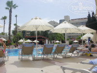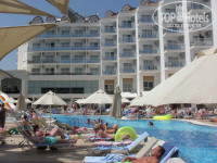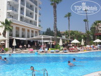 Отель хороший.Территория окружена забором.Выход через ресепшен в город и на пляж.Есть большой бассейн и детский маленький.,одна горка.Питание хорошее.Уборка каждый день.Полотенца пляжные и номерные меняются каждый день.Единственный минус все-таки это вторая линия и на море придется идти минут 10 до пляжа отеля.Персонал приветливый, но не все на ресепшене знают английский.Официанты молодцы.Очень стараются.Впечатление хорошее.Фрукты сливы , апельсины, яблоки, черешня, арбузы, дыня, айва.