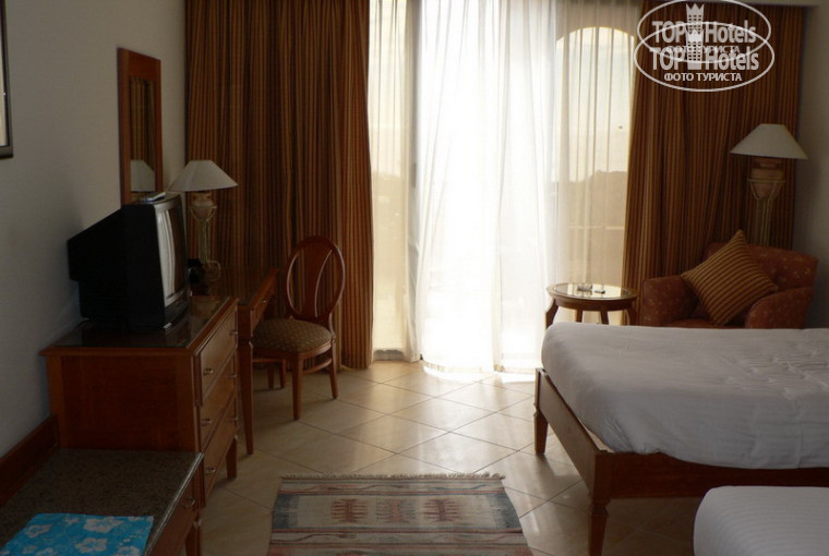 Номера просторные, с хорошей деревянной мебелью в классическом стиле. Удобные кровати, одеяла в ПОДОДЕЯЛЬНИКАХ (часто в других отелях роль пододеяльника выполняет вторая простыня). В номере есть сейф (бесплатно) и минибар (всегда полон, но цены очень негуманные). В некоторых номерах есть интернет (витая пара). Доступ платный – $14 в час. Надо иметь в виду, что все номера в отеле «видовые». Они бывают: Garden View, Pool View, Sea View, Mountain View, Beach Front View. Мы по совету знающих людей оплатили номер Beach Front View. В итоге, мы получили стандартный 2-х местный номер с роскошным видом на море и остров Тиран. При бронировании имейте в виду, что заказывая номер «без определенного вида» вы с вероятностью стремящейся к 100% получите самый отстойный номер в самом дальнем корпусе. И если в межсезонье, когда отель заполнен не полностью, за $20 на ресепшене можно договориться и переехать в равноценный номер в другом корпусе, то в высокий сезоне такое не пройдет. И не стоит рассчитывать, что оплатив самый дешевый номер и положив в паспорт $20 на ресепшене, вы получите номер категорией выше с хорошим видом. Этого не происходит никогда. Мы имели возможность пронаблюдать одну такую неудачную попытку наших туристов. При наличии свободных номеров вам могут предложить доплатить разницу в стоимости номеров за каждый день проживания и тогда вас переселят в номер категорией выше. Только, скорее всего, это выйдет дороже, чем сразу еще на родине забронировать этот же номер.