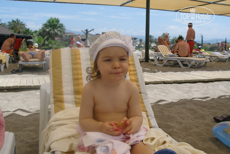 Еда просто 5+. Дочери младшей 2 годика, кормила с общего стола, т.к. детское меню подразумевает картошку фри и что-то типа нагетсов. Стульчиков детских хватало. На завтрак заливала хлопья молоком, амлетик, супчики даже очень съедобные для ребенка. Очень боялась за животик маленькой и с собой в поездку брала крупы, не требующие варки, заливала кипятком, масло туда и на пляже с яблочком докармливала. Но этого можно и не делать, повторюсь, всё ОООЧЕНЬ вкусное и съедобное. Курица каждый день, индейка, дорада, форелька, по вечерам телёнок, барашек целиком. Очень вкусно повар толму накрутил. Овощи, зелень, море разнообразных сладостей. Арбузики, дыни, мушмула, яблоки. Всё в достаточном количестве и никакой давки за едой, хоть и много людей. Один раз устроили обед на пляже с люля и печеными овощами. Кто писал о том, что плохо когда кормят по часам, так один приём пищи плавно переходит в другой, только в другом месте. Из ресторана в бар возле бассейна… Ужины особенно торжественны, с национальной живой музыкой. Пила вино и пиво. Вино чуть креплённое, не разбавленное, есть везде, хоть упейся)) Официанты внимательны ко всем, без исключения, даже без чаевых. Но мы всё время садились на террасе к одному и тому же мужчине и благодарили его, он знал, что мы придем, и ставил детский стульчик заранее. Наливал для меня вино, старшей и мужу сок, младшей водичку. В общем, очень внимательный.
