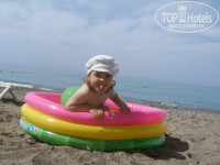 Про пляж, мелкая галька в перемешку с крупным песком ну и булыжники встречаются. Наш малыш с удовольствием играл с камушками, ходить по ним особо радости не испытавал. Рядом с лежаками песочек приятный. Вот там как раз и можно поиграть в тенечке. Малышу год и четыре. Дети что, постарше с удовольствием катались на волнах у береговой линии на различных надувных игрушках, даже горки не нужны.
