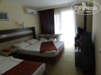 Номер хороший, ковролин, кровать-двуспалка, полуторка для старшего и кровать-манеж для малыша. Холодильник. На балконе два стула и столик пластиковые. Вид – на улицу и на море.