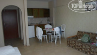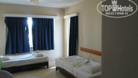 Жили вместе, вчетвером, поэтому номер у нас был Family. Две большие комнаты - первая типа гостиная: кухонный гарнитур, холодильник, стол, 4 стула, диван и 2 кровати. Вторая - спальня: двуспальная кровать, тумбочки, трюмо. Небольшая прихожая со шкафом, смежный санузел с душевой кабинкой и большой балкон с 4мя пластиковыми стульями. Все чисто, уютно, но, если приглядеться-тут надо подклеить, тут подкрутить, из кабинки вода подкапывает...Но это все - если приглядеться. А мы приходили только переодеться, помыться и поспать. Убирались каждый день, белье и полотенца меняли раз в 3 дня.