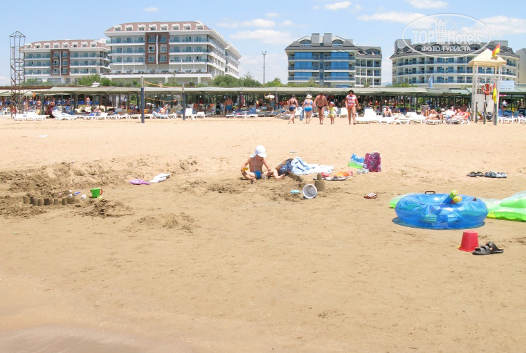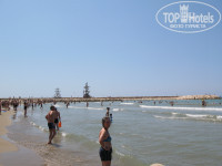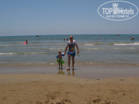 Пляж шикарный. Чистый. Широкая пляжная полоса, песочек, заход в море плавный-плавный, без единого камешка, с детьми рай. Даже когда были волны приличные (а у нас почти каждый день) 9-летний сын купался один спокойно, мы за ним с берега присматривали. Шезлонгами мы вообще не пользовались, т.к. постоянно с детьми, занимали один шезлонг без подстилки на солнце - вещи бросить. Мне не очень понравилось, что волейбольная площадка между тентами с шезлонгами и морем, слишком далеко получается первый ряд шезлонгов. Я в каких-то отелях видела наоборот. Около бара на пляже и душа есть детская площадка с навесом.