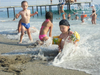 Там, где волны на берег накатывают - морской песок с мелкими камушками, заходя в воду начинается полоса камней покрупнее, но не булыжники. Такой массаж для ног даже полезен :) Стоит сделать буквально пару шагов и сразу становится достаточно глубоко, чтобы плыть, причем довольно резко эта глубина появляется. Там, где глубоко, дно уже песчаное, но ноги все равно уже его не достают. Однажды мы как-то прогуливались с детьми вдоль берега, прошли немало пляжей других отелей, практически везде каменистые пляжи, прямо целые плиты порой попадаются, так что пляж Динлера в этом отношении заметно выигрывает.