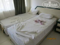 Номер довольно-таки приличный и просторный. Сантехника, конечно, не первой свежести, но зато у нас душ был со шлангом, снимался, снизу еще кран, напор отличный, горячая вода всегда была. Я сравнивала с отелем подороже, так там душ не работал, пришлось 2 раза вызывать, чтобы починили (с первого раза день только нормально проработал), кондиционер и холодильник тоже не работали. Здесь же кондиционер работал, правда, напрягало, что отключался, когда выходишь на балкон, а потом надо было заново настраивать, чтобы не дул вниз, на детей. Телевизор мы почти не смотрели, 1 русский канал точно был, а так дети больше смотрели турецкие мультики, обучались языку). Холодильник работал нормально, мы потом обнаружили, что телевизионная розетка не отключается, когда вынимаешь карточку, и включили в нее холодильник. Шкаф был с полками, а не только со штангой для плечиков, как в другом отеле, очень удобно.