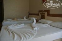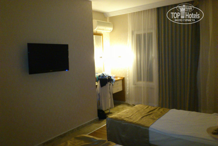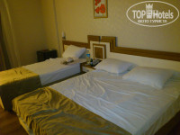 Приехали мы около 11 утра, не успели переодеться нам уже предложили пару вариантов заселения - либо въехать в обычные номера, либо вчетвером заселиться в большой номер с видом на бассейн и территорию. Мы выбрали разные номера, хоть и вид там был никакой - в одном номере - на теплицы (половина номеров в отеле имеет такой вид), зато там было очень тихо; в другом - на соседний отель и подъезд к отелю, здесь уже было слышно практически всю деятельность отеля. А в больших номерах я даже не представляю как спать - они ближе всего к дороге, а звукоизоляция окон оставляет желать лучшего (правда может это не во всех номерах). Шум в номере - это единственный недостаток номеров с нашей точки зрения. Сантехника прекрасная (только души у нас были не гибкие, но сама головка поворачивается), телевизоры большие и новые, обои, линолеум и потолки без изъянов, вообще чувствуется, что ремонт очень свежий; сейфы в номере разные (у нас был вмонтирован, у друзей в шкафу стоял ящик; стоит 3 доллара в сутки), балконы есть не у всех номеров. В стандартном номере вы найдете три кусочка мыла, три бутылочки шампуня, тапочки, набор для шитья (булавка, иголка, пуговица, несколько разных ниточек), шапочку для душа, три ватных диска, несколько ватных палочки, ну и конечно полотенца. В мини-баре в день заезда - пиво, вода и газировка, потом каждый день - 1,5л бутылка воды; почему-то не охлаждал, но разбираться не стали - вода и без охлаждения хранится. Кондиционер индивидуальный, работал хорошо в обеих номерах. Нам предлагали варианты переезда через несколько дней, но мы не стали менять номера.
