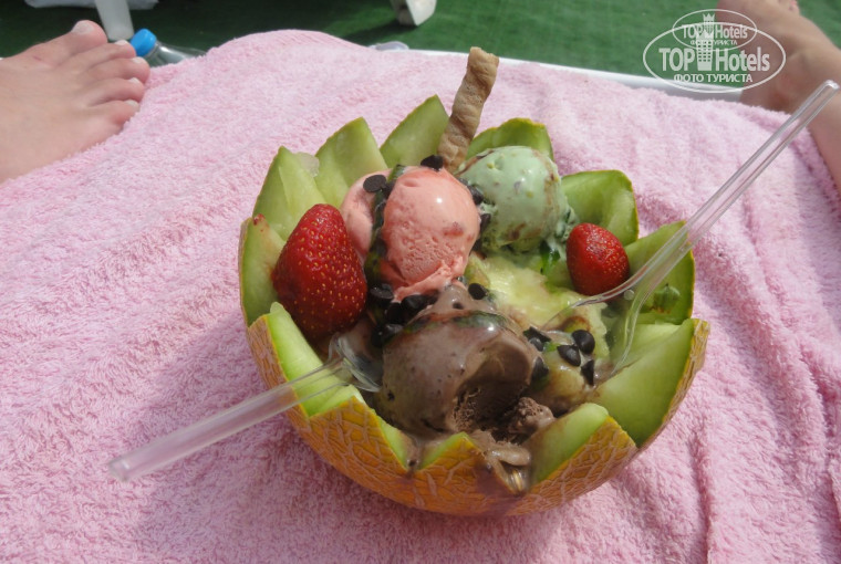 Еда. Еда разнообразная. Тут некоторые пишут, что мало мяса. Неправда. Мяса всегда достаточно, что-нибудь покушать можно найти. Овощей-море. Баклажаны, жареная рыбка, сладости. Для 3-ки -очень неплохо. (Раньше бывала только в 5* Кемера, так что есть с чем сравнить).Ресторан конечно маловат, советую приходить либо к открытию, либо на час попозже, когда основная масса людей уже покушает, но тогда вам прийдется искать себе вилки-ложки и пить из пластиковых стаканчиков. ( но нас и это совершенно не напрягало, потому что несчастный персонал просто с ног сшибался,все убирали,мыли, приносили...)