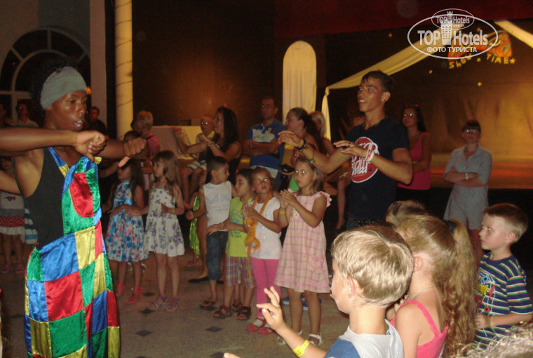 Многие ругали анимацию в отзывах. Нам понравились аниматоры. Особенно Мади, Картуша, Калуччи (извините, если имена с ошибками). Ребята очень обаятельны, всегда улыбаются, уже от этого настроение сразу улучшается. А еще они прекрасно танцевали (особенно Калуччи всегд добросовестно все движения показывал) и проводили массу всяких мероприятий. Дети в них души не чаяли и с нетерпением ждали начала детской дискотеки, да и многие взрослые тоже. Нам очень понравилась аквааэробика в исполнении Мади(главного ведущего), Картуша, Калуччи. Правда успели 2 раза всего сходить. Времени для скуки не было вообще, мы даже не во всех развлечениях успели поучаствовать. Главное не сидеть букой, а быть открытым человеком и не стараться влить в себя как можно больше бесплатного алкоголя. Отдельное спасибо хочется сказать Маше - она нас выручила из балконного плена. А еще она вроде такая маленькая, хрупкая, а с ребятней управляется здорово, все ее слушаются, и танцует она замечательно. Остальные ребята и девчата тоже молодцы, но как-то с ними меньше сталкивались - из 10 дней 4 потратили на экскурсии. Очень нравились вечерние программы, когда ребята сами танцевали, когда с отдыхающими конкурсы устраивали, а вот пародии как-то подкачали. Очень понравилась та, в которой все делали свое движение. Ну это кто что любит, многим нравились. Замечательное было факир-шоу.