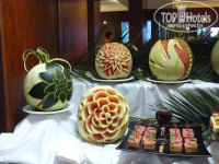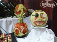 Вообще в столовой все замечательно продумано. Там есть две зоны: закрытая и открытая, на свежем воздухе. Все холодные закуски, салаты, торты и фрукты были в закрытой, а все, что жарили, в открытой, благодаря чему запахи из кухни не поподали внутрь здания. Вся еда была просто замечательной. А из фруктов повара создавали такие произведения искусств, что дух захватывало.
