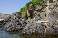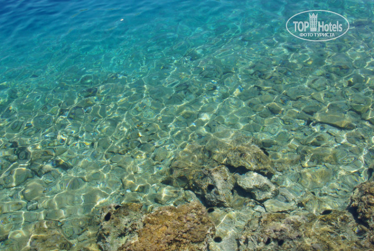 Если Вам захочется искупаться, Вам придется спуститься по крутой лестнице и корячиться среди валунов, пытаясь залезть в воду. Сама вода очень чистая, прозрачная, 24 градуса, освежает. Очень живописные скалы на пляже, таких скал нет больше нигде на острове. Скорее всего, это застывшая лава. Второй пляж муниципальный, но часть лежаков и зонтов арендует отель, поэтому за пользование ими платить не надо. Пляж галечный, без валунов, вход удобный.
