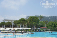 Территория отличнейшая!Много зелени.Много бассейнов:один глубиной 2м,один большой 1.4м,несколько детских,релакс бассейн,бассейн с волнами.Есть декоративный ручей с водопадом.У воды нет запаха хлорки.Бассейны постоянно начищаются. Жилые корпуса отдельно от главного здания.Отель находится у гор.Каждый раз любовались потрясающими видами!Много баров и мест,где можно перекусить.У бассейнов где-то с обеда начинают разливать холодные напитки,раздавать фруктовый лед.Продают вкуснейшую кукурузу.Питание отличное.Есть все:мясо,рыба,овощи,фрукты...Есть даже стол с диетической едой.Пирожным и турецким сладостям нет предела)Дни тематические.В один день итальянская еда,потом мексиканская...и т.д. В Пятницу или субботу(точно не помню) были потрясающие десерты!Просто нереальной красоты и вкус такой же)единственный минус в еде-неспелые дыни и арбузы.Напитки тоже на высоте.Правда,свежевыжатые соки только морковные и апельсиновые.В Пиано баре вы можете зайти в интернет и выпить вкусные коктейль.Мы брали Пина Каладу,Голубую лагуну,бейлис.И у всего отличный вкус.Так же рядом с отелем продают ооочень вкусные орехи.