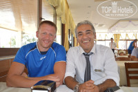 Турецкий персонал умеет работать быстро и красиво. Официанты, в сорокаградусную жару одетые в полное форменное обмундирование, включая черные закрытые ботинки, уливаясь потом, мгновенно убирали ненужную посуду. Особенно удивил их вождь и идейный вдохновитель красавец-мужчина Сурат, который видя, что его орлы не справляются с наплывом работы, впрягался сам и убирался вместе с ними. Нам это показалось удивительным, а такое поведение достойным. Сурату привет! Обещанные фото!