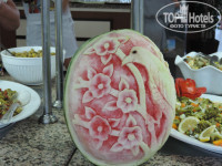 Питание: Довольно разнообразно.Из особенного,что мы там увидели - барашек на вертеле 1 раз,кабанчик 1 раз, КРЕВЕТКИ 1 раз (очень удивило).Много рыбы было (полностью запечённая или филе).Очереди были (5-10 мин макс).Не хватало мест иногда - ОТЕЛЬ ПЕРЕНАСЕЛЕН! Из 600 человек 280 это дети (узнали у гида). Поэтому приходили сразу после открытия на обед или ужин.