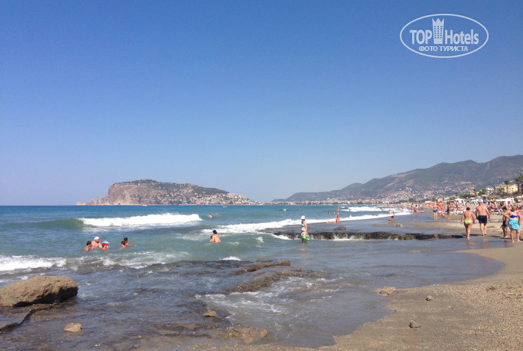 Через дорогу от отеля,совсем рядышком, есть переход. Пляж плохой.Мы не брали лежаки (зонтик и шезлонг платные),загорали на полотенце. Море постоянно было неспокойное,в море плавают водоросли, листочки, и всякий мусор,вода грязная.Рядом каменные глыбы-на волнах страшно плавать.