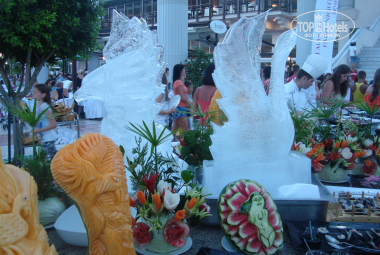 Отдыхали в этом прекрасном отеле с 06 по 20 июля текущего года. Впечатлений масса, и все они только положительные. Понравилось абсолютно все. Мы приехали рано - в семь утра уже были на ресепшен. Заполнили карточки, оставили чемоданы и пошли сначала на завтрак, а потом на пляж. Вернулись в одиннадцать, и наши номера были уже готовы. Разместили нас в пятом корпусе, сразу по переходу от лобби, с видом на пруд с кувшинками. Сам по себе корпус поразил своей нестандартностью. Представьте, вместо замкнутого узкого коридора - оранжерея и ажурные мостики, соединяющие номера, расположенные напротив друг друга. Чужих хождений по коридору не слышно вообще! Кстати, номера оборудованы звонком, поэтому стука соседей вы тоже не услышите (как это часто бывает в отелях по ночам). Стандартный номер, какой был у нас, очень просторный и выполнен в светло-бежевых тонах. Уборка номеров хорошая, пылесосили каждый день, независимо от чаевых. Пляж в отеле реально очень большой, лежаков много. Вход в море неприятный, но для нелюбителей гальки есть пирс, с которого можно и спускаться, и нырять. Как же это замечательно! Девятилетнего сына обычно в море затащить трудно, а здесь, благодаря возможности понырять, проблем не было. А как хорошо промывается нос морской водой! Кстати, на этом пирсе аниматор проводит аквааэробику ( она стоит на пирсе, а мы - в воде). Первый отель, где я занималась аквааэробикой в море! Это просто кайф! Вообще, анимация - это отдельная тема! Скажу лишь, что мой сын получил одиннадцать грамот, он участвовал во всех играх и турнирах, и даже в детском шоу. Питание в отеле тоже очень понравилось. Еда не острая, многие блюда адаптированы под русских и украинцев. Утром - два вида каши (рисовая и манная), на ужин - тушеная картошка с курицей, как домашняя. Фруктов полно, десерты тоже изумительно вкусные. Отношение персонала доброжелательное на всех уровнях. В общем, рекомендую отель с удовольствием!