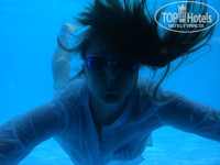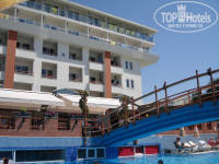 Территория отеля маленькая, но очень красивая, ухоженная. Всего четыре бассейна - один закрытый, на цокольном этаже, один большой - 150 см,в нем Али и Нино проводят водное поло для детей постарше и для взрослых, один малюсенький - 40 см,для самых маленьких деток, и последний - с двумя горками - 80 см, в нем проходила водная гимнастика. Есть детская площадка.