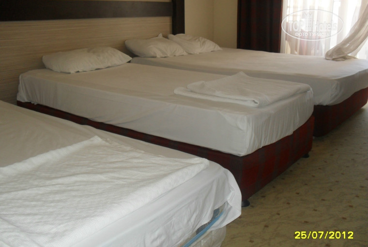 Заселение: в номер, рассчитанный на две кровати они умудрились забить еще и матрас, бросив его просто на пол. В итоге, трое взрослых и ребенок жили на 12 квадратах. На балконе вместо стола старый табурет, дверь не закрывается плотно, сейф платный, дверные замки на входной двери межкомнатного типа, у меня дома, в туалете круче. Полотенца не меняют, если бросите его на пол, вам его поднимут и сложат обратно, но это наблюдение девушек из муравейника напротив. Кстати. есть там такой интересный пунктик в правилах отеля: с вас возьмут штраф в случае, если вы измажете постельное бельё! Так что пару комплектов захватите с собой, на всякий случай))) Территория отеля практически отсутствует, у нас дворы больше при многоэтажках.... Питание специфическое, дети такое не едят, так что, если решите брать туда ребятишек, захватите, заодно, электроплитку и продукты. Шутка, конечно, но доля истины есть.... Бассейн небольшой, хлорируется ежедневно, из-за чего мы все потом еще неделю этим самым и пахли, ребенку пришлось покупать капли в глаза, потому что появилось стойкое раздражение. Туалет при бассейне за 10 дней ни разу не убрали, свет не горит, сливной бак не работает, точнее сказать, работает постоянно, ибо вода не перекрывается в силу поломки, перила тоже отсутствуют, так что будьте осторожны при спуске туда, там очень скользко!.... Море рядом, но готовьтесь к тому, что там сильнейший прибой и купаться не очень удобно, а на дне валуны, что создает лишние проблемы и травмы.... Если едете развлечься, то вам точно не в этот отель, потому что анимации практически нет, и она однообразная и занудная настолько, что больше мешает, чем веселит. После завтрака аквааэробика, после обеда водное поло, потом пляжный волейбол и в десять вечера детская "дискотека" под одну и ту же музыку и с одними и теми же конкурсами. В одиннадцать все прекращается, в том числе и разлив напитков. В понедельник и пятницу есть дискотека в подвале, но туда никто не идет, потому что аппаратура работает ужасно и напитки не включены, как это ни странно, то есть, пиво вы будете покупать за 4 доллара. Мы там были, видели, развернулись и ушли. Зато вас ваши же аниматоры вывезут на дискотеку в город, после 23 часов, за 7 долларов, но там тоже все за денежку. Короче, грузите музыки побольше в свои телефоны и сами себя развлекайте, а еще не забудьте в аэропорту алкоголя прикупить, ибо тут вам кроме пива, водки, джина и вина сухого ничего не нальют. Правда, один раз соседка по столику, ибо там столы сдвинуты, как в столовках, пришла с "шампанским". На вопрос, где взяла, ответила, что попросила у бармена шампанское, он налил ей белое вино и разбавил его спрайтом, вот так вот.)))) И готовьтесь добираться от и до Анталии три часа при прилете и отлете. Есть плюсы, конечно -самостоятельные вечерние прогулки по городку и экскурсии от туроператора Но в саму Аланию надо добираться на автобусе... Вроде бы ничего не забыла... Дорогие мои, прежде чем брать туда путевку, ДУМАЙТЕ! О статусе отеля говорит уже то, что иностранцев вы там не увидите, их туда не селят, а обслуга практически не говорит по-русски, хоть и работает там по пять лет, на одном месте, с русскоговорящим контингентом!!!!