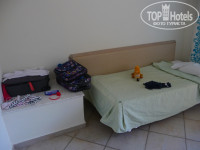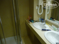 две комнаты, одна сразу за входом, с телевизором на длинном узком столе с ящиками, зеркалом, двумя односпальными соединенными кроватями, прикроватными тумбами, кондиционером. Далее длинный узкий коридор, в котором справа встроены шкафы (их много, что очень удобно, так как позволило раздеться с детьми - была их часть и наша), а слева - вход в туалетную комнату. В этой комнате - душевая кабина и ванна одновременно (очень удобно для большой семьи!), ну и унитаз конечно-же, а также две раковины , большое зеркало, много места для принадлежностей. При заселении в ванной лежали шампунь и лосьон для тела, а также твердое мыло и малюсенькие губки. Все фирменное - с надписью "линдос отель". Запасы все время пополнялись, однажды даже принесли не фирменные лосьон, гель для душа на основе оливкового масла - было очень приятно. Все хорошего качества. В номере также нашлись наборы с нитками и иголкой. Сантехника новая, в ванной все очень чисто и красиво. Вода горячая была всегда, причем с хорошим напором.
