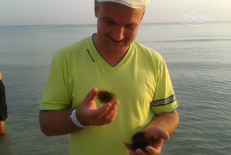 Прилетели утром (в 7 часов по местному), отель еще спал (точнее, туристы еще спали). Время заселения- 14, поэтому мы пошли изучать территорию, знакомиться с пляжем. Море было чистейшее, песочек как мука. Супер! Нашли в воде морских ежей и сразу возник вопрос: а как купаться-то? Наступишь еще на такого морского обитателя. Но в другие дни мы ежей больше не встречали, видимо их собирают.