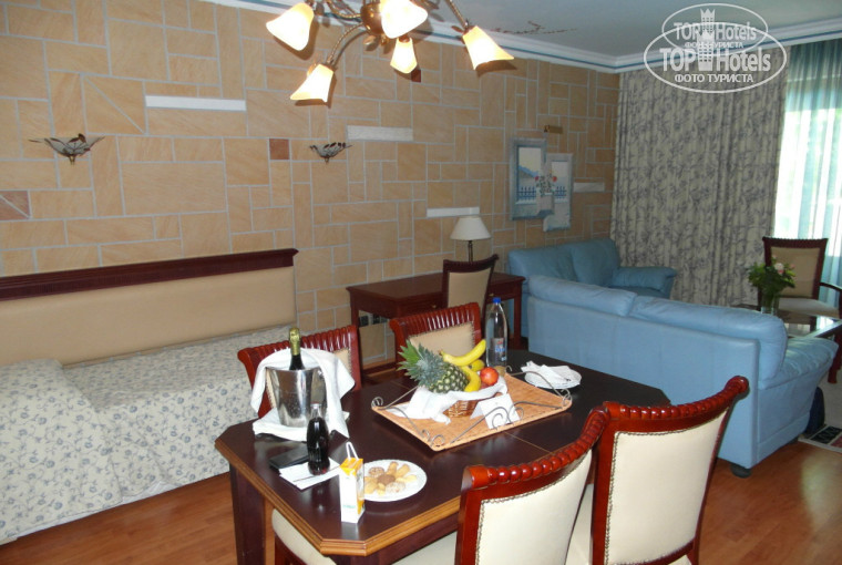 Описываю номер. Вход. Слева сан.узел с ванной. Прямо гостиная. В гостиной мини-бар (платный при любом типе питания). Большой шкаф с вешалками и выдвижными ящиками. Стол со стульями, кровать, мягкий уголок, стол. Телевизор ЖК, ДВД. Из гостиной вход в спальню. В спальне большая кровать (не две сдвижные , как писали в предыдущих отзывах, а именно одна большая).Прикроватные тумбочки. Большой шкаф с выдвижными ящиками. Места для того чтобы удобно разложить вещи предостаточно. В спальне обыкновенный старомодный телевизор. Из спальни вход во второй, большой сан.узел. В нём ванная-джакузи. Индивидуальный кондиционер в обеих комнатах. Из обеих комнат выход на террасу с бассейном. Бассейн немаленький 27 кв.м. На террасе лежаки, зонт, стол, диванчик и кресла. Не хватало сушилки. Перезвонили на гест-релейшен. У нас уточнили, какую сушилку мы предпочитаем. На ножках, или ту, которая крепится и через несколько минут принесли ту, которую просили. Это к теме сушилок, которую обсуждали в предыдущих отзывах. Господа, но сделайте лишнее движение - позвоните на гест-релейшен и выскажите свои пожелания вместо того, чтобы натягивать верёвки и потом сетовать в отзывах на отсутствие сушилок. А то, как у Жванецкого: «Двадцать километров пешком, чтобы не спрашивать»:-) Убирали очень хорошо. Ежедневно меняли бельё, всё тщательно протирали, мыли полы. Каждый вечером, вне зависимости от того во сколько бы мы не уходили, ещё раз делали лёгкую уборку. Меняли использованные полотенца, выбрасывали мусор, убирали в сан.узлах, ну и конфетки на постель, как полагается. По номеру только два замечания. В гостиной много розеток, а в спальне всего одна свободная около телевизора. И второе - раздвижные двери между гостиной и спальней. Они частично состоят из матового стекла, так что свет из другой комнаты мешает. И очень плохо подогнаны сами двери. Для того, чтобы их открыть-закрыть нужно приложить недюжинные усилия. Муравьёв у нас в номере не было.