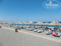 БАССЕЙНЫ И ПЛЯЖ. Сам пляж находится в очень красивой бухте, с приятным видом. Море чистое. Ни разу не штормило, либо небольшие волны, либо полный штиль. Берег галечный, но галька нетравматичная, даже такие неженки , как мы с дочкой, тапочки для плаванья ни разу не одели, хотя на всякий случай с собой прихватили. Вход в море резкий, быстро становится глубоко, так что за малышами глаз да глаз. А вот сам пляж, как место отдыха, не понравился. Зонтики маленькие и тени для двух лежаков просто впритык. Так что нам для трёх лежаков приходилось занимать два зонтика рядом. Сами зонтики старенькие, кривенькие, очень низко посаженные, даже такая малявка, как я, умудрилась пару раз головой задеть, а муж так постоянно ругался.
