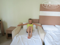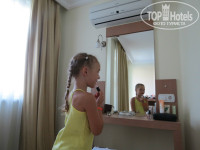 добираться конечно долговато, но такая красота вокруг,природа как с картинки любоваться и любоваться!приехали рано в 7 утра,сразу же отправили на завтрак, но если учесть что в самолете кормили 2 раза за ночь, кушать не очень хотелось, познакомились с рестораном в 7 народу практически нет т.к. завтрак до 10 никто не торопится!заселили только к 10 за это время мы успели обойти всю территорию отеля, посмотреть пляж,сразу же конечно захотелось в море,но перебороли позывы переодеться в туалете и дождались номера, на рецепшене нисколько не оставляли номер нам достался на первом этаже очень уютный и хороший небольшая лоджия с видом на дорожку к морю, уличную дорогу и море!в номере кондиционер, 4 кровати, 3 тумбочки, 2 больших зеркала, 3пластмасовых стульчика на балконе и 1 раскладной в комнате, холодильник (в котором мы совершенно свободно хранили воду и фрукты), шкаф с вешалками, в ванной раковина, унитаз, душ, фен, налито жидкое мыло, стояло 3 маленьких бутылочки шампуня, но мы брали свой т.к. волосы очень привередливы, но и местный вполне приличный! сразу было 2рулона бумаги потом ещё 3 оставили нам этого хватило за глаза ещё осталось!2 больших полотенца, 2 маленьких 1 для ног!