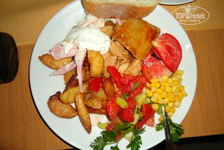 Питание не очень разнообразное, но приготовлено всё достаточно вкусно. Выбор блюд небольшой был. Так что каждый найдёт что-то себе по вкусу. Всегда была картошка, рис, мясо в основном курица, иногда говядина. Различные салаты из овощей, рыба, омлет, колбаса, сыр. Фрукты: арбуз, слива, виноград. Сладости были, но мы, как правило до них уже не добирались. У нас были завтраки-ужины и нам вполне хватало. Т.к напитки там разбавленные и пить их не очень то и хотелось, а днём нас и не бывало в отеле. Если на экскурсиях, то обед в них включён.