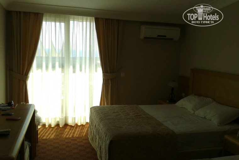 Номер у нас был чудесный. Сразу скажу-не бесплатно. Мы платили на ресепшене сразу же. Положили деньги в паспорт. И ни разу об это не пожалели, судя по рассказам тех, кто не платил при заселении, но потом в итоге всё равно платили. Номер с видом на море. Тихо, спокойно. Вся анимация, бассейн и т.д. были в другой части отеля, поэтому ничего не мешало. В номере всё работало исправно. Было две кровати: 2спальная и 1спальная. Санузел работал исправно всегда.