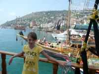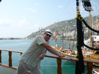 Так как сама путёвка с семейным номером на 21 день нам обошлась недёшево, то похвастаться экскурсиями не можем... У гидов Пегаса в отеле брали только «Дельфинарий». На улице брали «Пиратскую яхту». Но честно сказать, вот все говорят, что экскурсии на улице дешевле, чем в отеле... Но ведь и сервиса-то намного меньше... За нами (мало того что опоздал) приехал микроавтобус и начал кружить по Конаклам ещё собирать туристов (за одной парочкой к одному и тому же отелю подъезжали три раза – их всё не было)... Напихалось в этот микроавтобус куча народа, некоторые сидели у друг друга на коленках. В итоге попали на яхту в самый последний момент. На первой палубе не хватило места, поднялись на вторую палубу. Устроились на лежаки непонятного вида. В «ватер-клоузет», так сказать, босиком лучше не заходить, на полу непонятно что – или моча, или вода с унитаза. А моряки-пираты, мало того, что им за экскурсию заплатили, так они ещё всю поездку не отстают от тебя: то фото предлагают, то майки, то мороженое, пиво, чипсы... А к морской качке-то мы не привыкшие, так если честно плоховасто было и ни какая еда не лезла... А в конце поездки по морю «пираты» ещё начали ходить по палубам со шляпой, мол чтобы им ещё туда денюжку положили!!!! Блин недовольные были, когда мы отказались..... Но зато поплавали по морю и красивые виды пофотали... А так, хотелось бы сравнить и у гидов экскурсию тоже по морю заказать. Но это, наверно, в следующую поездку....
