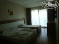 НОМЕР. Скажу от себя, номер просто потрясный, новый, чистый с чудеснейшим видом из окна от пола до потолка и отличным санузлом. К тому же на двоих нам дали трехместный номер. Стартовая загрузка минибара, как уже говорили, состояла из Pepsi, фанты, пива и полутора литров воды. Вода пополнялась каждый день. Бытовая техника и мебель новые, марки ВЕКО)))) Сейф 3 доллара в сутки. И что важно, бесперебойный Wi-Fi, я созванивалась по скайпу с родителями. Вообщем работало все исправно. Хочу отметить один момент, если Вы плохо спите или засыпаете, то не стоит брать номер с видом на море. Во-первых, анимация шумная, во-вторых рядом дорога, а звукоизоляция окон и номеров мягко говоря не самая лучшая. Но анимация заканчивается уже ближе к 11, а шум дороги нас не сильно беспокоил, поэтому спали мы неплохо.