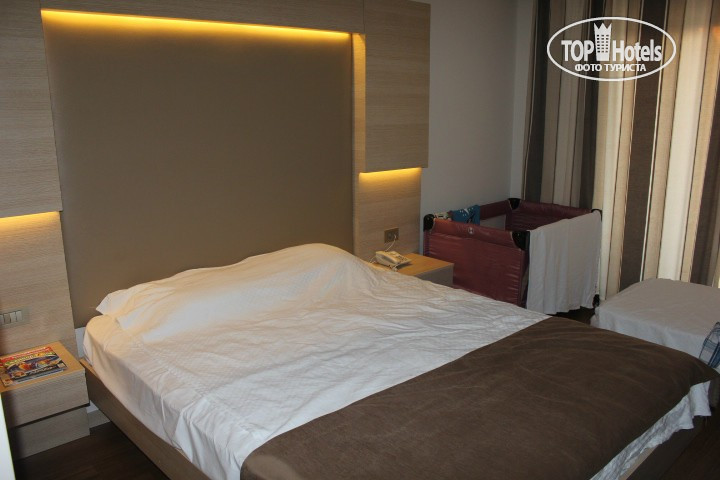 Номер стандартный (№1909) на 5-ом этаже. Сначала мы немного расстроились, что вид не на море, а на противоположную сторону, а потом успокоились - зато тихо и спокойно! В номере одна большая кровать, но нам принесли ещё кроватку-манеж (для младшенького) и евро-раскладушку (для старшего). Места было предостаточно, всё легко поместилось! Всё в исправном состоянии! Этажей в первом корпусе - 9 (-3; -2; -1; 0 рецепшн,1; 2; 3; 4; 5).
