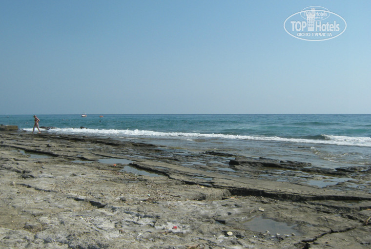 Оставляет желать лучшего - грязновато и камни, ребенок там поранил ногу. Ходили купаться чуть правее отеля. Лежаки и зонты не брали, они платные. Один раз съездили на пляж Клеопатры (на 101 автобусе 10-15 мин ехать, 1,5 дол.стоимость проезда)- там конечно, совсем другое дело - и чисто, песочек желтый, никаких камней. Да и еще - море немного штормило, были волны.