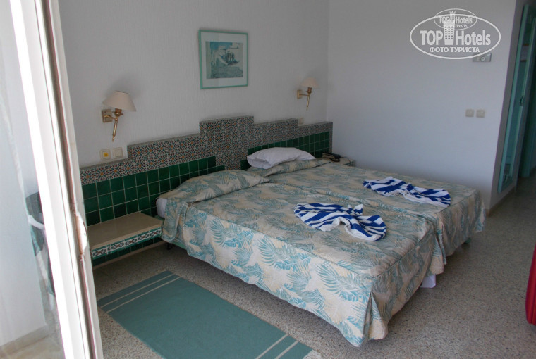 РАЗМЕЩЕНИЕ. Заселение в 14-00. По прибытию одевают браслеты и можно пользоваться всей инфраструктурой отеля. Мы прилетели где-то в 8 утра, нам не сложно было дождаться 14-00. А вот тем, кто прилетел после 24-00, да еще с маленькими детьми, было нелегко. Прочитав отзывы, мы хотели получить номер в корпусе №2 с нечетной стороны. Это новый корпус. Из номеров боковой вид на море. Хотя далеко идти до ресепшена по коридорам. До соседнего отеля приличное расстояние и он совершенно не мешает. Третий корпус аналогичный, но там нечетные номера выходят на систему кондиционирования и хозпостройки соседнего отеля. Судя по отзывам, многим там не понравилось. Итак. Нечетные номера отеля выходят на внешний периметр отеля. Четные номера - во внутренний двор отеля, соответственно на анимацию и вечерние шоу. Анис, русскоговорящий администратор отеля, объяснил нам, что во второй корпус заселяют только семьи от 4-х человек, так как там суприоры. Тогда мы попросили нешумный номер повыше этажом. Пояснили, что готовы за это запалить 20 баксов. Анис поискал свободные номера и дал нам номер 1323. Когда мы зашли в него, сразу поняли, что о лучшем и мечтать не надо. Пошли и отдали денежки. Прекрасный вид на сад и соседний отель, который далеко. Так что можно сидеть на террасе хоть в чем мать родила. Но море не видно. А вот с соседних номеров 1321, 1319 видно, так как там отель заворачивает. Пожалуй это лучшие номера в первом корпусе. Совет. Как я и читал в отзывах, в первом корпусе проблемы с розетками. Нормальная только одна - под телевизор. Рядом розетка со штырьковым заземляющим контактом. Но под него спокойно втыкается плоская вилка наших устройств. Так что неудобство возникало только при подключении нетбука, приходилось отключать тв. В ванной на розетке под фен есть розетка для бритвы. Я там заряжал аккумуляторы для фотика. Так что берите с собой разветвитель-удлинитель, если едите парой. Насколько я знаю из отзывов - в новых корпусах проблем с розетками нет. Номер состоит из двух полутораспальных кроватей. Удобных, нормальных. Некоторые пишут, что они разъезжаются. Вообще-то кровати с двух сторон ограничены тумбами, встроенными в стены и разъехаться вряд-ли могут. У нас не разъезжались. Две подушки на каждую кровать, две простыни, покрывало, теплые пледы. В номере так-же стоит большой стол, банкетка, низкий столик. На террасе пластиковый стол и два пластиковых стула. Большой стол и прикроватные тумбочки, а также мойка в ванной - каменные, выложены кафельной плиткой и мрамором. В номере три пепельницы - в туалете, в комнате, на террасе. Вообще курить в Тунисе можно везде. Даже в аэропорту. Интересная особенность номера - отсутствует люстра в комнате. Освещено все хорошо, даже в шкафах есть встроенные светильники. А вот в комнате люстры нет :) Только настенные бра. Так что книгочтеи, оставьте книжки дома :) или используйте электронные читалки. Телевизор в номере простой кинескопный, русских каналов много. И новостные и развлекательные и информационные. Причем в телеке каналов больше, чем напечатано на бумаге перед ним. Пульт ДУ у нас лежал прямо в номере. Только со сдохшими батарейками. Мы тоже не стали их покупать - не ТВ смотреть приехали. Кондиционер и холодильник работали нормально. Но кондер старинный. Когда на улице было сильно жарко, он явно не справлялся. Хорошо, что таких дней было все