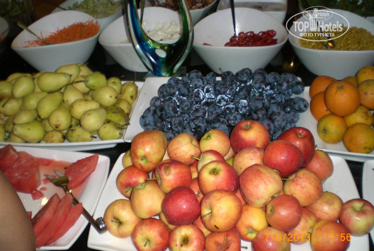 Мы отдыхали в отеле с подругой с 05.09.2013 по 14.09.2013. В Мармарисе в первый раз, в Турции третий. Заселили быстро в течение 10 минут. Номер дали с видом на море и бассеин, хотя мы за него не доплачивали (цена за номер с таим видом была на 100 долларов дороже). Но нам повезло) Единственный минус, на нашем балконе не было приспособлений для сушки купальников, хотя в других номерах были, мы просили решить вопрос на ресепшен, но в ответ ничего, но мы присособились развешивать купальники на стульях балкона. Еда просто шикарная, было все что только хочешь, даже и трети всего не попробовали, фрукты разнообразные, десерты, мясо разное, рыба тоже и красная слабосоленая и жареная и вареная и запеченая и в кляре, через день было мороженное. Напитки пробовать не советую, все местные, вино не вкусное, от пива голова болит, коктели -- один краситель, еще ром с колой куда ни шло. Уборка в номерах так себе, убирали каждый день, но постель за 9 ночей поменяли 1 раз за две ночи до отъезда, забывали убирать пепельнцу с балкона, один раз мы поставили ее в номере, для того чтобы уборщица выбросила, так она выбросила и поставила карточку а номере не курить, хе, потом еще несколько дней переживали, что выстоаят штраф за курение в номере (а мы ж не курили). Пляж хороший, но мы всегда находили место в любое время когда бы ни пришли, прямо возле воды, если нет, то просили сотрудника отеля, который работает на пляже, он всегда приносил и ставил туда куда нам надо, даже от денег очень сиьно отказывался. Море чистое, но немного прохладнее, чем Средиземное. Температура в сенябре очень приятная, в среднем 34 градуса, хотя когда уезжали была +43 (это аномально для этого периода). Персонал все пишут, что не говорит по русски, но в пределах наших потребностей, все понимают, "что будете пить", если попросить ложку, вилку, салфетку и т.д,, это в барах, в ресторане вообще даж поговорить можно было, а вот ресепшен ни слова не говорит, почему-то. Для меня главное было чтобы все близко было, и море и ресторан и бассеин, поэтому мне отель оч понравился, а вот с детьми там делать нечего, территория маленькая, но для нас это был большой плюс. Отдыхают в основном иностранцы, на выходные приезжают турки с семьями и маленькими детьми, а под конец заехало много рускоговорящих. Экскурсии дешевле на улице брать. Шопинг, если кожа, то магазин Маджестик, рядом с отелем в сторону города, по противоположной стороне, дальше еще у них два магазина, в ближнем сказать что надо в те два, то отвезут бесплатно, хороший текстиль дальше по той же стороне Фидэн Текстиль, магазин с фиксированными не дорогими ценами, там брали постельное белье от 30 до 200 долларов, бамбуковые полотенца. Но главное в Мармарисе -- это ночная жизнь, все туристы почему-то выбирают клуб Арена, но местные нам посоветовали Бэк стрит, оч классная дискотечка с хорошей европейской музыкой в сочетании с турецкой и зажигательный диджей, рекомендую. В целом отдых удался, шопинг тоже, пришлось покупать дополнительный чемодан. В аэропорт кстати не больше 20 кг не считая ручной клади, за перевес 50 евро, если что. Не смотря на мелкие минусы, это была лучшая пятерка в которой я была, и обязательно вернусь в Голден Рок в следующем году!