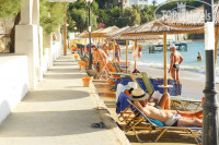 Пляж если стоять лицом к морю слева узких, а если пойти направо к центру, где прокат ложок, там широкий (может уже и не нашего отеля), но там нет четких ограничений по территории, отдыхай, где нравится . Песок, заход где песок, где мелкая галька, есть плиты, после них глубина, ест плавные заходы, опять же выбирайте, где нравится, пляж длинный. Мы не разу не платили за лежаки и зонтики, пользовались. Приходили с 8,30-11 и 15,30-18. Попадали на сборщиков 2-3 раза, но в это время были на своем коврике. А тень там всегда найти можно, от зданий падает. Зонт нам и не нужен был.