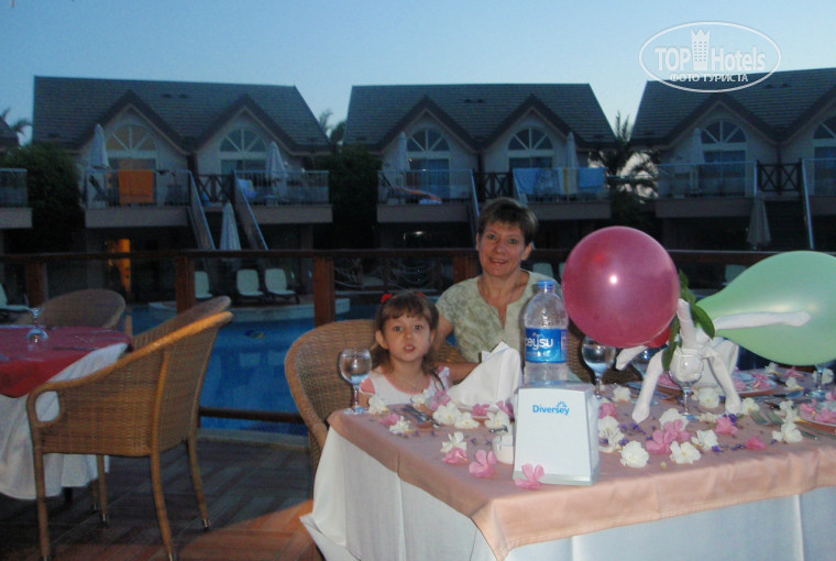 Отдыхали с мужем и дочерью 4 лет с 15 по 25 сентября 2013 года. Отель нам порекомендовали наши знакомые, сказали, что мы не пожалеем об отдыхе. По приезду я поблагодарила их за рекомендацию, потому как 11 дней отдыха промчались, как 1 день. Мы получили такой заряд положительных эмоций, что будем жить ими до следующего отпуска. Мы все в полном восторге! Приехали в отель в 7 утра, заполнили анкету, отдали паспорта, паренек молодой, по-моему Расул, сказал, что номеров готовых нет и надо ждать. Мы, наученные опытом, оставили багаж в камере хранения, там же переоделись, пошли позавтракали и начали осваивать территорию. В 11 вернулись на рецепшн, этот же русскоговорящий паренек, сказал, что еще номера не готовы, мы сели в холле и стали ждать. Смотрю, прибыли автобусы с новой партией туристов, которых за полчаса разместили и номера для них нашлись. Я подошла к отельному гиду от Пегас-туристик, им оказался Айваз, попросила содействия в нашем размещении, он вместе со мной прошел на рецепшн, переговорил с другим человеком, к своему стыду имя его не прочла, и он тут же выдал мне электронный ключ, а носильщик загрузил чемоданы на тележку и мы отправились в номер № 3142. Номер великолепный, просторный, с видом на виллы и правым углом на море. Для меня был приятный и неожиданный сюрприз от отеля на мой день рождения: когда мы пришли с моря, чтобы переодеться на обед, увидели на столике бутылку вина, фрукты на тарелке в подарочной упаковке, бокалы и столовые приборы, а вечером меня ожидали в ресторане на виллах, где был зарезервирован столик, украшенный лепестками цветов. До этого 4 раза у меня день рождения получался на отдыхе в Турции и ни в одном отеле ничего подобного не было. Я хочу выразить огромную благодарность администрации отеля и персоналу по работе с гостями, за такое признательное отношение к именинникам.