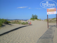 2 лежака и зонт стоят 15 лев в день!!! Все обходились лежанием на песке. Пляжные полотенца , честно, мы не спрашивали. Привезли с собой. :) Но что то мы не видели никого с полотенцами отеля. Все были со своими. У бассейна лежаки бесплатные. Кстати, мы первые два дня ходили на пляж по песчаным дюнам, а можно сразу после калитки повернуть налево и пройти через территорию отеля, который стоит у моря. Около него пляж нашего отеля.